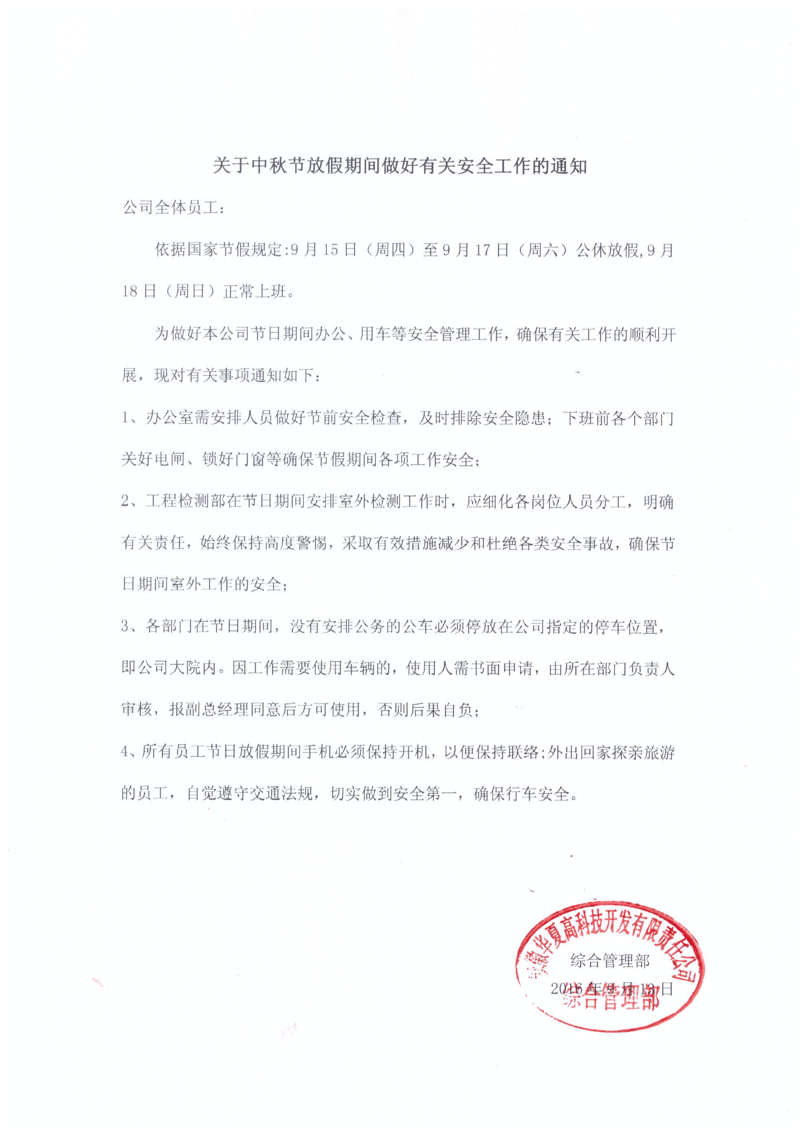 關于中秋節放假期間做好有關安全告知的通知